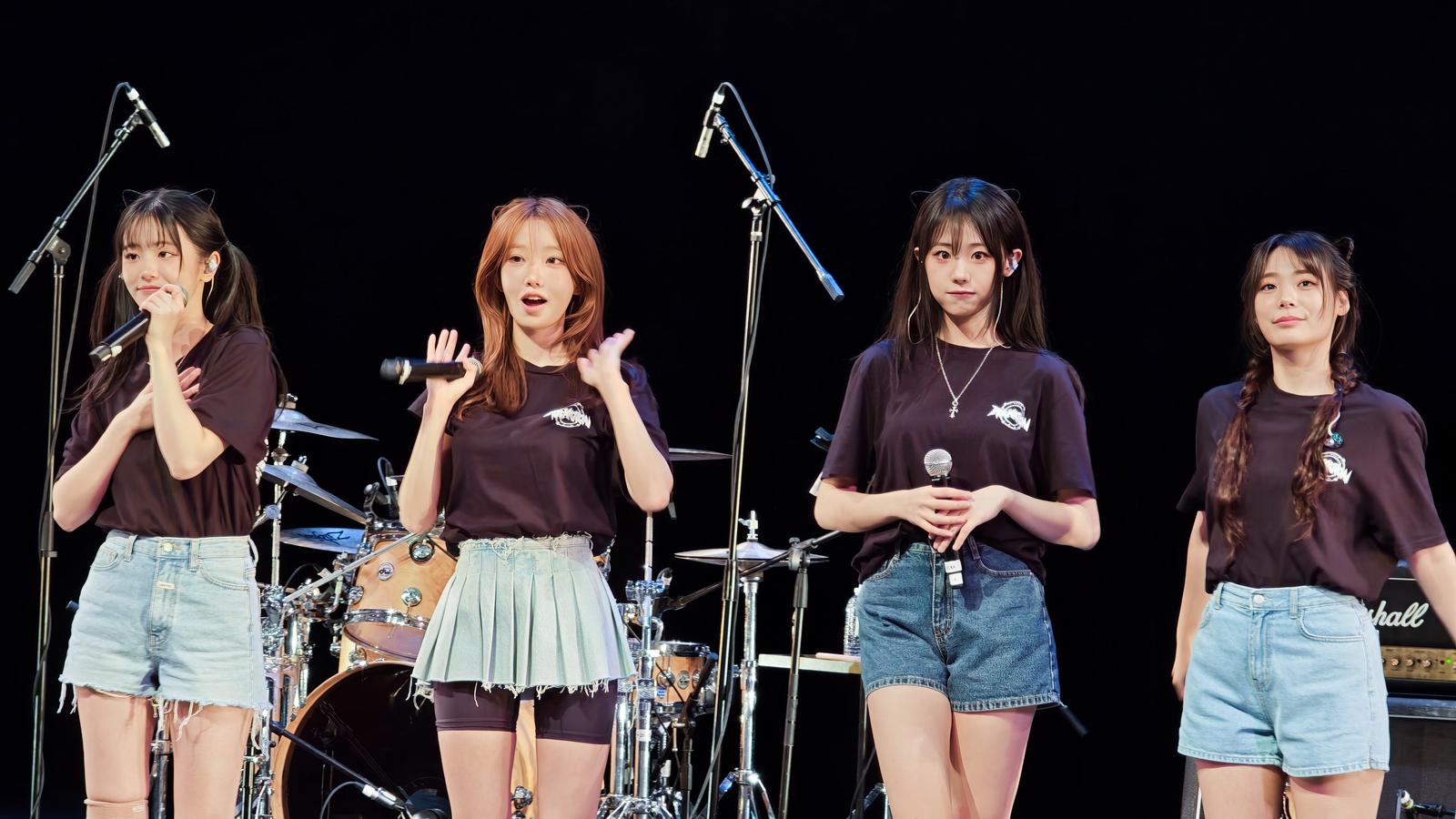 QWER performs J-rock and anime song-style music, citing inspiration from manga like "Oshi no Ko" and "Bocchi the Rock!" as well as artists like YOASOBI. They blend rock band performance with K-pop production and idol aesthetics.